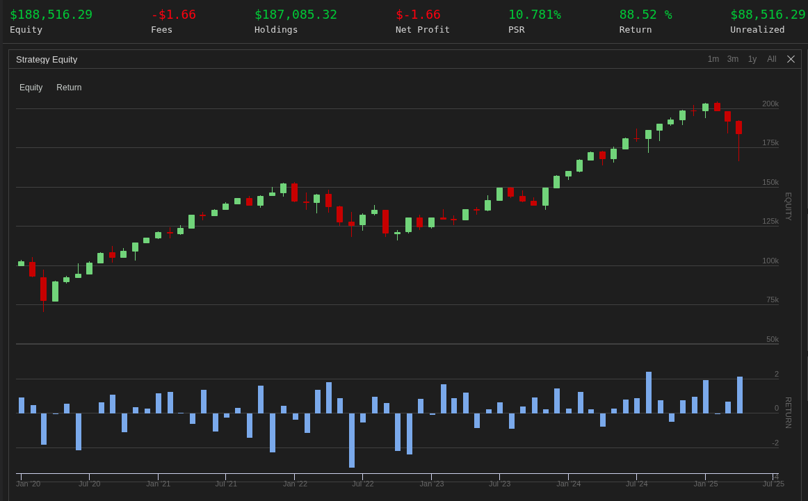 SPY serves as the benchmark, delivering an 88% return over the period, with a Sharpe ratio of 0.42 and a CAGR of 12.6%. Its maximum drawdown — during the COVID-19 crash — reached 33%.